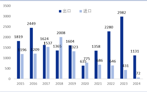 2015-2024年我国军贸进出口概况