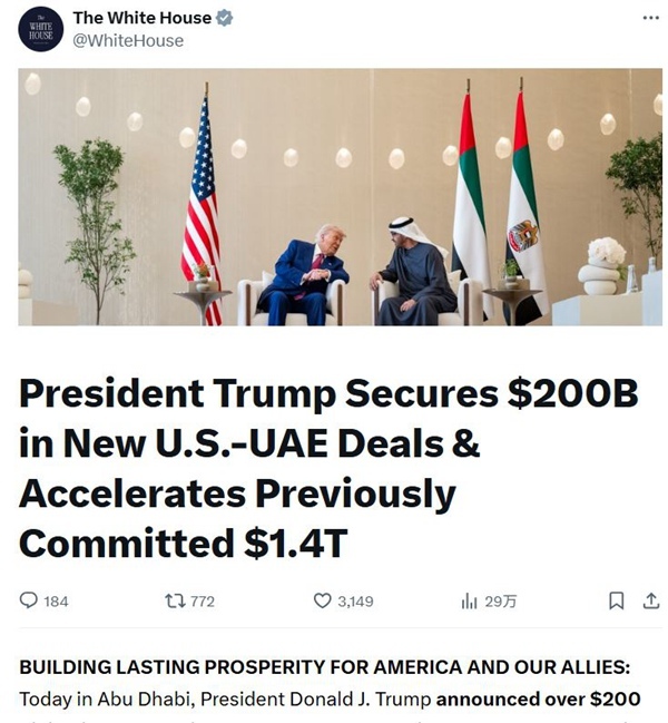 除AI领域合作之外,白宫在社交媒体发布的情况说明显示,阿联酋国家航空公司阿提哈德航空承诺投资145亿美元购买28架波音客机,包括波音787和777X。在能源领域,美国的埃克森美孚、西方石油、依欧格资源公司将与阿联酋阿布扎比国家石油公司合作扩大石油和天然气生产,协议价值600亿美元。