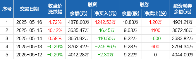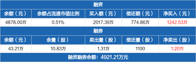 融资方面,当日融资买入2017.39万元,融资偿还774.86万元,融资净买入1242.53万元。融券方面,融券卖出1.31万股,融券偿还1100股,融券余量10.83万股,融券余额43.21万元。融资融券余额合计4921.21万元。