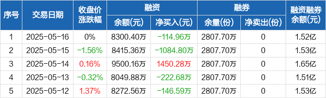 融资方面,当日融资买入1444.02万元,融资偿还1558.98万元,融资净偿还114.96万元。融券方面,融券卖出0份,融券偿还0份,融券余量2807.7万份,融券余额6918.17万元。融资融券余额合计1.52亿元。