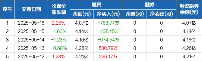 融资方面,当日融资买入975.9万元,融资偿还1739.67万元,融资净偿还763.77万元,连续3日净偿还累计1905.76万元。融券方面,融券卖出0股,融券偿还0股,融券余量0股,融券余额0元。融资融券余额合计4.07亿元。
