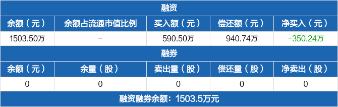 融资方面,当日融资买入590.5万元,融资偿还940.74万元,融资净偿还350.24万元。融券方面,融券卖出0份,融券偿还0份,融券余量0份,融券余额0元。融资融券余额合计1503.5万元。