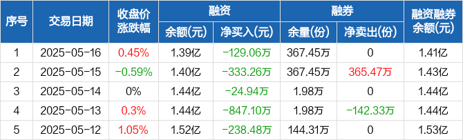 融资方面,当日融资买入647.84万元,融资偿还776.9万元,融资净偿还129.06万元,连续8日净偿还累计2185.83万元。融券方面,融券卖出0份,融券偿还0份,融券余量367.45万份,融券余额247.66万元。融资融券余额合计1.41亿元。