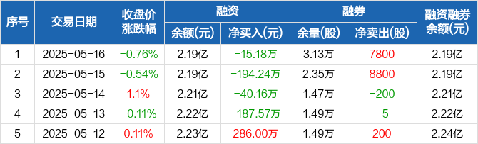 融资方面,当日融资买入299.01万元,融资偿还314.19万元,融资净偿还15.18万元,连续4日净偿还累计437.15万元。融券方面,融券卖出7800股,融券偿还0股,融券余量3.13万股,融券余额28.45万元。融资融券余额合计2.19亿元。