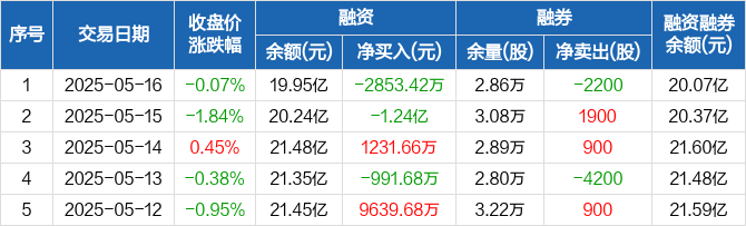 融资方面,当日融资买入8386.12万元,融资偿还1.12亿元,融资净偿还2853.42万元。融券方面,融券卖出1700股,融券偿还3900股,融券余量2.86万股,融券余额1225.8万元。融资融券余额合计20.07亿元。