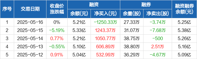 巨人网络融资融券信息显示,2025年5月16日融资净偿还1250.33万元;融资余额5.21亿元,较前一日下降2.34%。