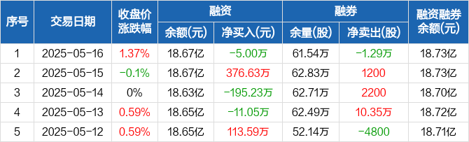 融资方面,当日融资买入2710.15万元,融资偿还2715.15万元,融资净偿还5万元。融券方面,融券卖出800股,融券偿还1.37万股,融券余量61.54万股,融券余额638.79万元。融资融券余额合计18.73亿元。