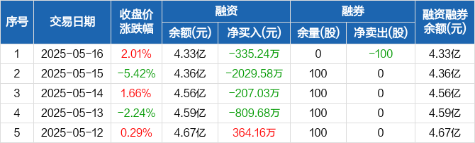 融资方面,当日融资买入4429.91万元,融资偿还4765.15万元,融资净偿还335.24万元,连续4日净偿还累计3381.53万元。融券方面,融券卖出0股,融券偿还100股,融券余量0股,融券余额0元。融资融券余额合计4.33亿元。