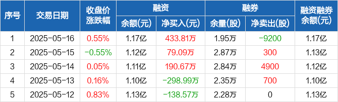 融资方面,当日融资买入1094.64万元,融资偿还660.84万元,融资净买入433.81万元,连续3日净买入累计703.57万元。融券方面,融券卖出200股,融券偿还9400股,融券余量1.95万股,融券余额35.76万元。融资融券余额合计1.17亿元。