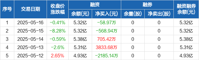 融资方面,当日融资买入3836.56万元,融资偿还3895.53万元,融资净偿还58.97万元。融券方面,融券卖出0股,融券偿还0股,融券余量0股,融券余额0元。融资融券余额合计5.32亿元。
