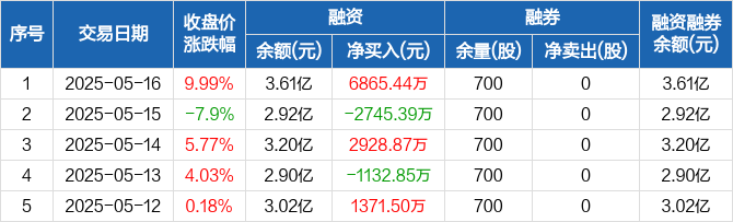 融资方面,当日融资买入2.57亿元,融资偿还1.88亿元,融资净买入6865.44万元,净买入额创历史新高,净买入额两市排名第14。融券方面,融券卖出0股,融券偿还0股,融券余量700股,融券余额8708元。融资融券余额合计3.61亿元。