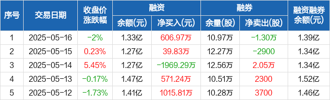 融资方面,当日融资买入2318.25万元,融资偿还1711.28万元,融资净买入606.97万元。融券方面,融券卖出400股,融券偿还1.34万股,融券余量10.97万股,融券余额617.5万元。融资融券余额合计1.39亿元。