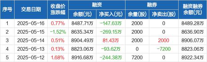 融资方面,当日融资买入368.47万元,融资偿还516.1万元,融资净偿还147.63万元。融券方面,融券卖出0股,融券偿还0股,融券余量2000股,融券余额1.57万元。融资融券余额合计8489.28万元。