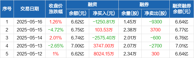 太辰光融资融券信息显示,2025年5月16日融资净偿还1250.81万元;融资余额6.62亿元,较前一日下降1.85%。