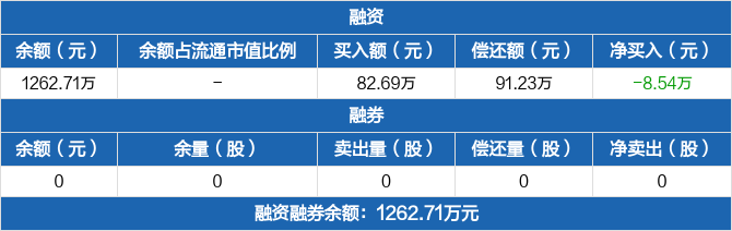 融资方面,当日融资买入82.69万元,融资偿还91.23万元,融资净偿还8.54万元。融券方面,融券卖出0份,融券偿还0份,融券余量0份,融券余额0元。融资融券余额合计1262.71万元。