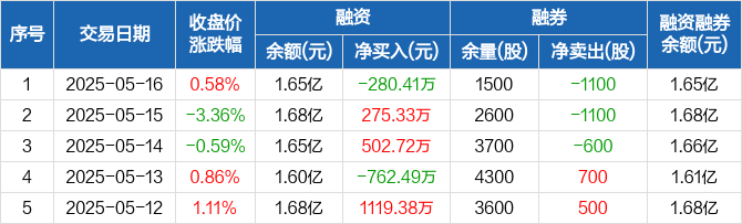 融资方面,当日融资买入426.14万元,融资偿还706.55万元,融资净偿还280.41万元。融券方面,融券卖出0股,融券偿还1100股,融券余量1500股,融券余额7.32万元。融资融券余额合计1.65亿元。