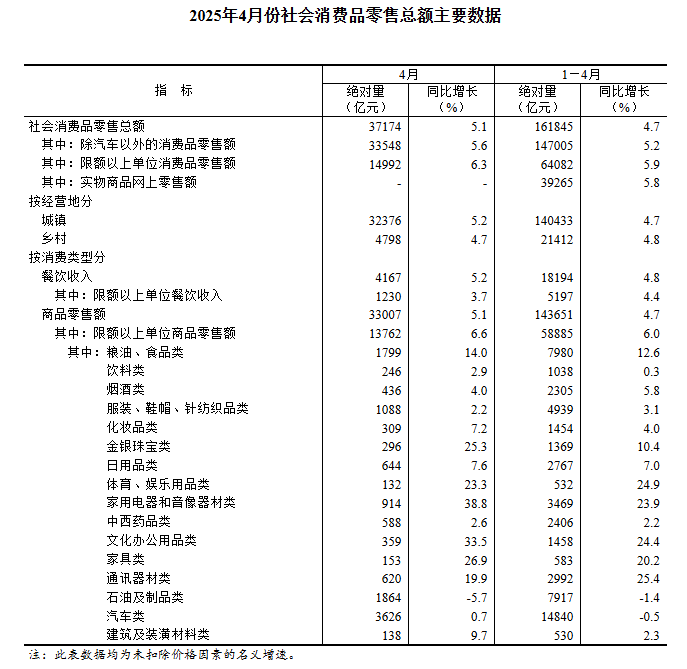 国家统计局:4月份家电和音像器材类商品零售额914亿元 同比增长38.8%