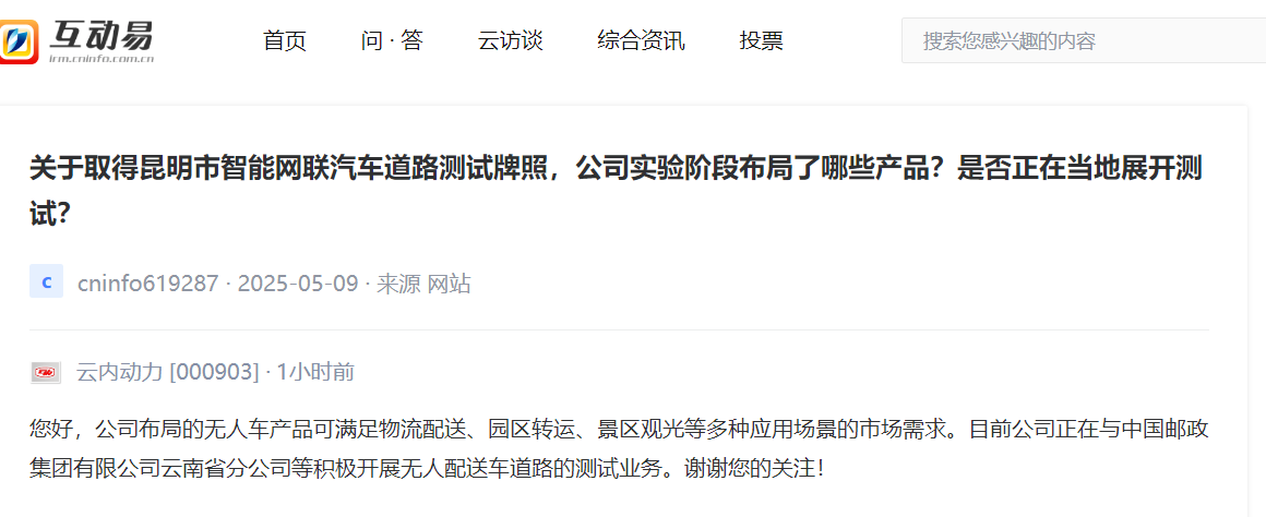 上证报中国证券网讯云内动力19日在互动平台上回答投资者提问时表示,公司布局的无人车产品可满足物流配送、园区转运、景区观光等多种应用场景的市场需求。目前公司正在与中国邮政集团有限公司云南省分公司等积极开展无人配送车道路的测试业务。