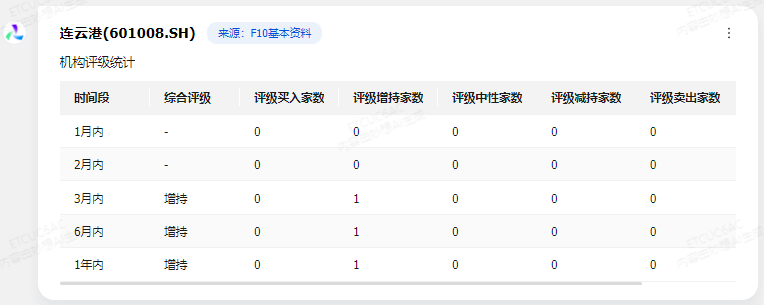 截至2025年5月19日,连云港的最新机构评级为“增持”。这一评级在近1年内保持一致,近3月内、6月内及1年内均有1家机构给出“增持”评级,无其他类型评级。