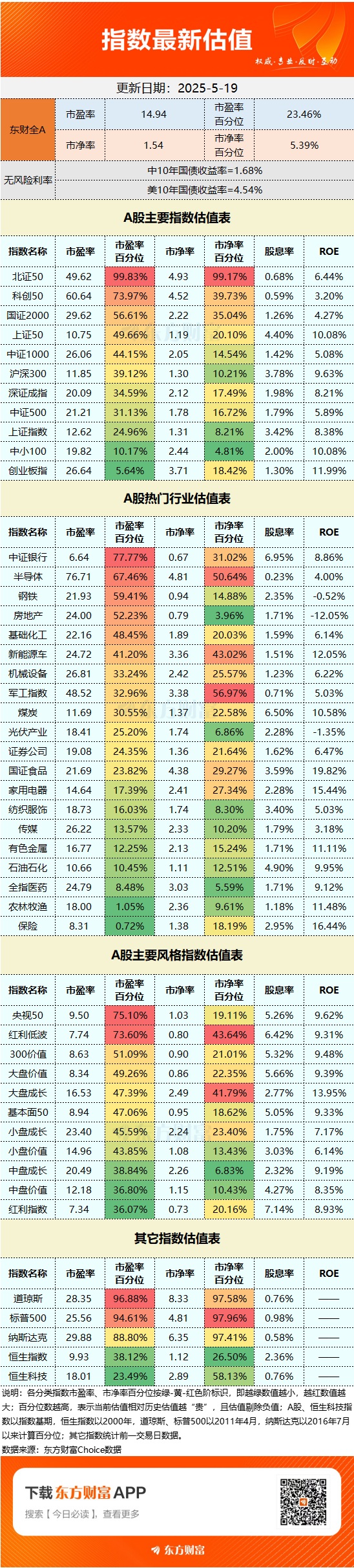 截至5月19日收盘,东方财富Choice数据显示,东财全A市盈率为14.94倍,市盈率百分位为23.46%;市净率为1.54倍,市净率百分位为5.39%。