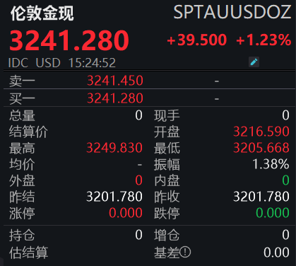 5月19日,国际金价大幅反弹。截至记者发稿,伦敦金现涨超1%,盘中最高触及3249.83美元/盎司。