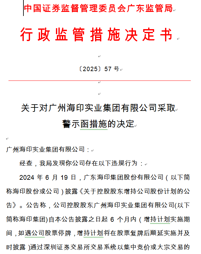 广东证监局称,海印集团未完成前期作出的承诺,构成《上市公司监管指引第4号——上市公司及其相关方承诺》(证监会公告〔2022〕16号,以下简称《监管指引第4号》)第十五条第一款规定的违反承诺情形。根据《中华人民共和国证券法》第一百七十条第二款、《监管指引第4号》第十七条的规定,广东证监局决定对海印集团采取警示函的行政监管措施。海印集团应当吸取教训,加强证券市场法律法规学习,杜绝再次发生此类违法行为。