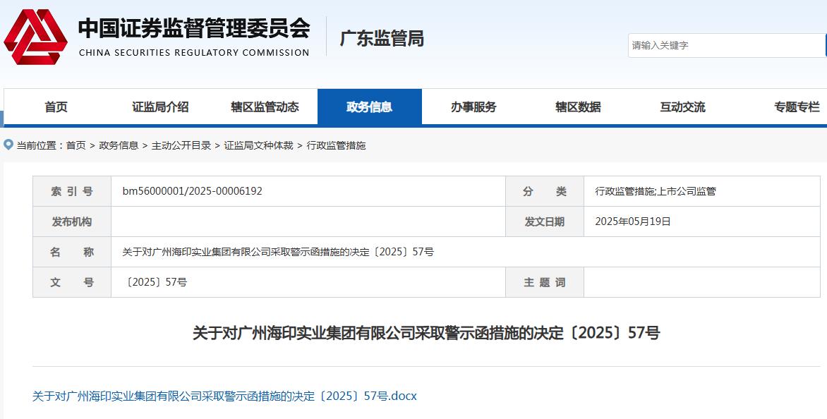 5月19日,广东证监局官网信息显示,广东证监局发布关于对广州海印实业集团有限公司(以下简称海印集团)采取警示函措施的决定(以下简称《决定》)。
