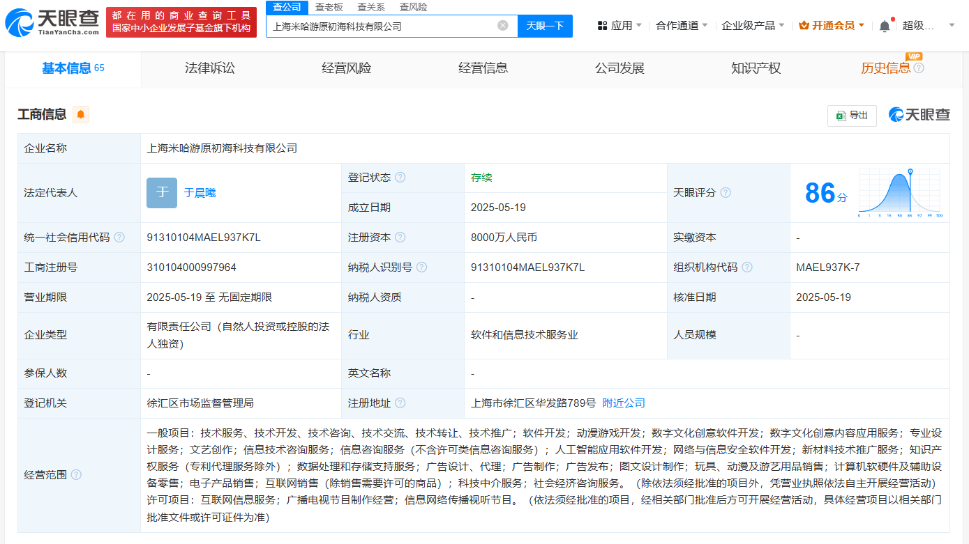 南方财经5月19日电,天眼查App显示,近日,上海米哈游原初海科技有限公司成立,法定代表人为于晨曦,注册资本8000万人民币,经营范围包括动漫游戏开发、数字文化创意软件开发、人工智能应用软件开发等。股东信息显示,该公司由上海米哈游网络科技股份有限公司全资持股。