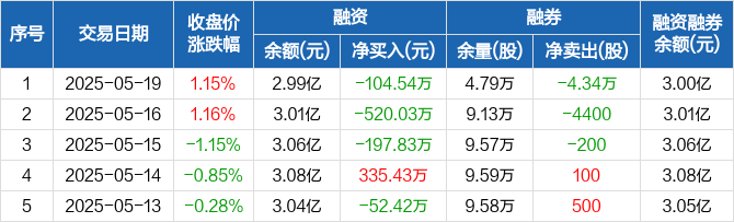 融资方面,当日融资买入142.8万元,融资偿还247.34万元,融资净偿还104.54万元,连续3日净偿还累计822.4万元。融券方面,融券卖出0股,融券偿还4.34万股,融券余量4.79万股,融券余额16.91万元。融资融券余额合计3亿元。
