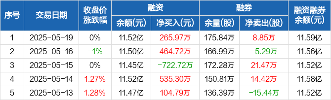 融资方面,当日融资买入7512.62万元,融资偿还7246.66万元,融资净买入265.97万元。融券方面,融券卖出14.11万股,融券偿还5.26万股,融券余量175.84万股,融券余额696.33万元。融资融券余额合计11.59亿元。