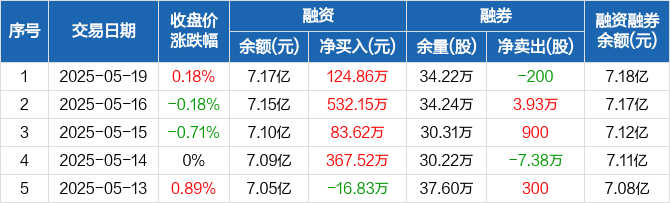 融资方面,当日融资买入816.42万元,融资偿还691.55万元,融资净买入124.86万元,连续4日净买入累计1108.15万元。融券方面,融券卖出2600股,融券偿还2800股,融券余量34.22万股,融券余额191.97万元。融资融券余额合计7.18亿元。