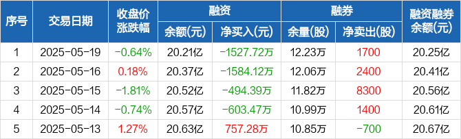 融资方面,当日融资买入4211.15万元,融资偿还5738.87万元,融资净偿还1527.72万元,连续4日净偿还累计4209.71万元。融券方面,融券卖出3000股,融券偿还1300股,融券余量12.23万股,融券余额415.82万元。融资融券余额合计20.25亿元。