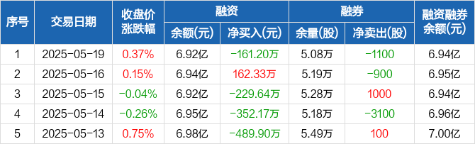 融资方面,当日融资买入1178.99万元,融资偿还1340.19万元,融资净偿还161.2万元。融券方面,融券卖出0股,融券偿还1100股,融券余量5.08万股,融券余额136.6万元。融资融券余额合计6.94亿元。