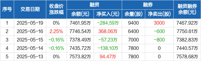 融资方面,当日融资买入421.17万元,融资偿还705.76万元,融资净偿还284.59万元。融券方面,融券卖出3000股,融券偿还0股,融券余量9400股,融券余额5.97万元。融资融券余额合计7467.92万元。