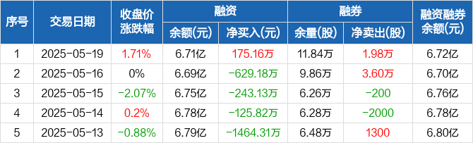 融资方面,当日融资买入1038.01万元,融资偿还862.85万元,融资净买入175.16万元。融券方面,融券卖出1.98万股,融券偿还0股,融券余量11.84万股,融券余额119.82万元。融资融券余额合计6.72亿元。