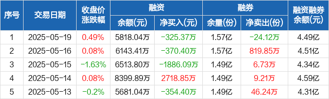融资方面,当日融资买入434.97万元,融资偿还760.33万元,融资净偿还325.37万元,连续3日净偿还累计2581.85万元。融券方面,融券卖出1.74万份,融券偿还25.86万份,融券余量1.57亿份,融券余额3.9亿元。融资融券余额合计4.49亿元。