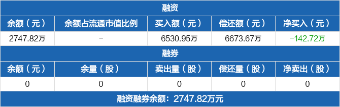 融资方面,当日融资买入6530.95万元,融资偿还6673.67万元,融资净偿还142.72万元,连续3日净偿还累计1210.96万元。融券方面,融券卖出0份,融券偿还0份,融券余量0份,融券余额0元。融资融券余额合计2747.82万元。