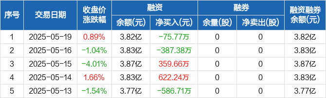 融资方面,当日融资买入1144.06万元,融资偿还1219.82万元,融资净偿还75.77万元。融券方面,融券卖出0股,融券偿还0股,融券余量0股,融券余额0元。融资融券余额合计3.82亿元。