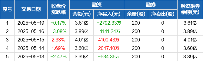 融资方面,当日融资买入6031.63万元,融资偿还8823.95万元,融资净偿还2792.33万元。融券方面,融券卖出0股,融券偿还0股,融券余量200股,融券余额1192元。融资融券余额合计3.61亿元。