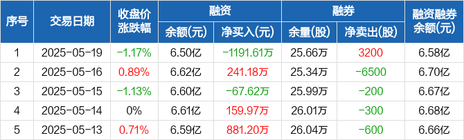 融资方面,当日融资买入690.76万元,融资偿还1882.37万元,融资净偿还1191.61万元。融券方面,融券卖出3400股,融券偿还200股,融券余量25.66万股,融券余额717.97万元。融资融券余额合计6.58亿元。