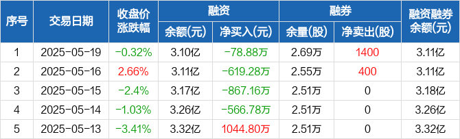 融资方面,当日融资买入1901.51万元,融资偿还1980.38万元,融资净偿还78.88万元,连续4日净偿还累计2132.09万元。融券方面,融券卖出1400股,融券偿还0股,融券余量2.69万股,融券余额41.4万元。融资融券余额合计3.11亿元。