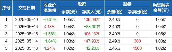 融资方面,当日融资买入885.4万元,融资偿还779.31万元,融资净买入106.09万元。融券方面,融券卖出0股,融券偿还0股,融券余量2.49万股,融券余额8.12万元。融资融券余额合计1.05亿元。