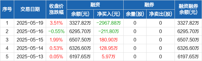 融资方面,当日融资买入475.14万元,融资偿还3443.02万元,融资净偿还2967.88万元。融券方面,融券卖出0股,融券偿还0股,融券余量0股,融券余额0元。融资融券余额合计3327.82万元。
