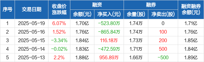 融资方面,当日融资买入1871.2万元,融资偿还2395万元,融资净偿还523.8万元。融券方面,融券卖出0股,融券偿还0股,融券余量1.74万股,融券余额82.44万元。融资融券余额合计1.71亿元。