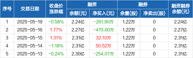 融资方面,当日融资买入463.28万元,融资偿还725.17万元,融资净偿还261.9万元。融券方面,融券卖出0股,融券偿还0股,融券余量1.22万股,融券余额10.47万元。融资融券余额合计2.24亿元。