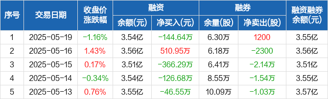 融资方面,当日融资买入956.56万元,融资偿还1101.2万元,融资净偿还144.64万元。融券方面,融券卖出2300股,融券偿还1100股,融券余量6.3万股,融券余额75.16万元。融资融券余额合计3.55亿元。