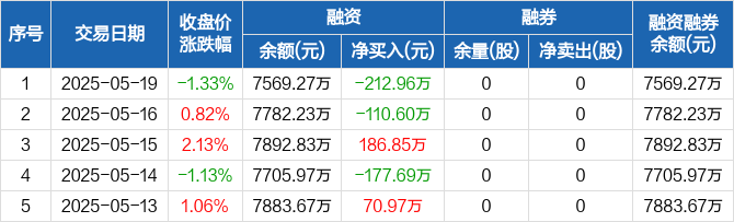 融资方面,当日融资买入638.87万元,融资偿还851.83万元,融资净偿还212.96万元。融券方面,融券卖出0股,融券偿还0股,融券余量0股,融券余额0元。融资融券余额合计7569.27万元。