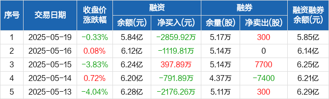 融资方面,当日融资买入1854.9万元,融资偿还4714.83万元,融资净偿还2859.92万元。融券方面,融券卖出700股,融券偿还400股,融券余量5.17万股,融券余额124.54万元。融资融券余额合计5.85亿元。