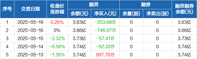 融资方面,当日融资买入810.83万元,融资偿还1064.51万元,融资净偿还253.68万元,连续4日净偿还累计1110.4万元。融券方面,融券卖出0股,融券偿还0股,融券余量0股,融券余额0元。融资融券余额合计3.63亿元。
