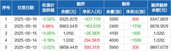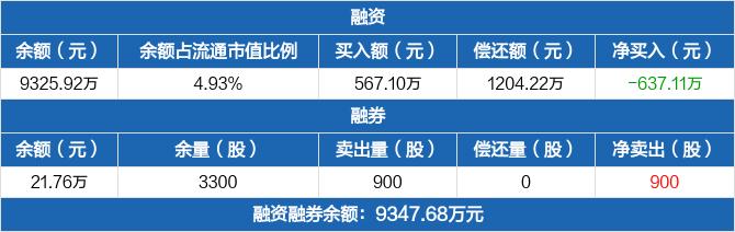 融资方面,当日融资买入567.1万元,融资偿还1204.22万元,融资净偿还637.11万元,连续3日净偿还累计827.1万元。融券方面,融券卖出900股,融券偿还0股,融券余量3300股,融券余额21.76万元。融资融券余额合计9347.68万元。